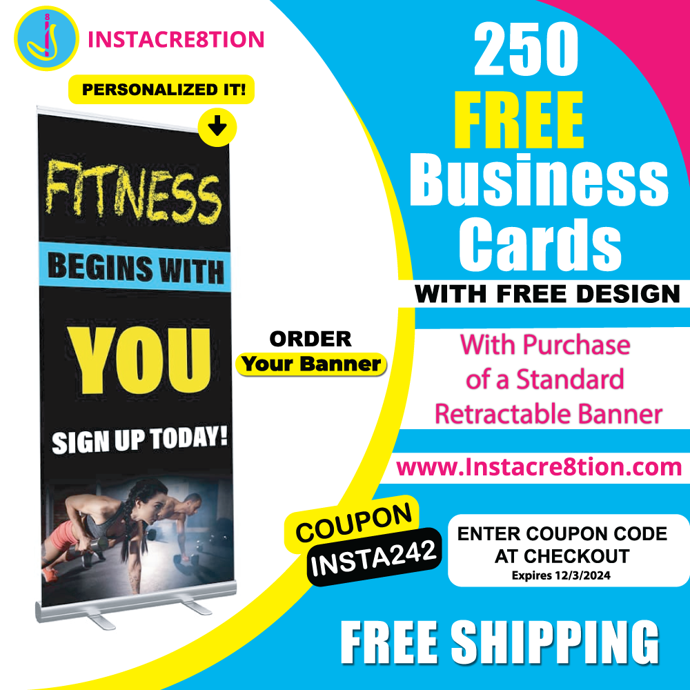 Get a high-quality retractable banner for your events, trade shows, or storefront, and enjoy 250 free glossy business cards with your order.