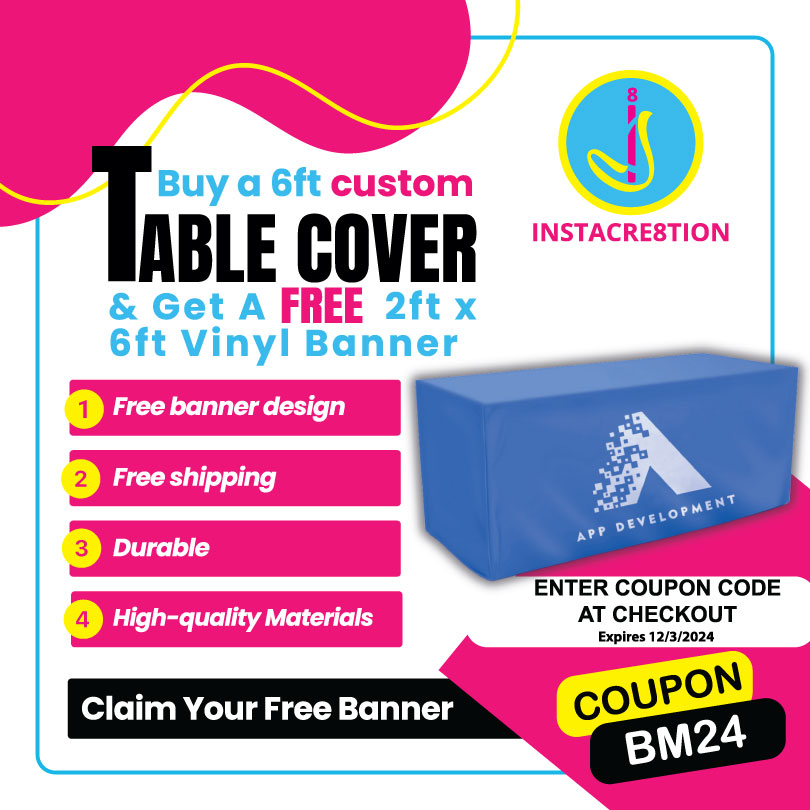 Get your brand noticed at events and expos! Purchase a 6ft custom table cover and receive a free 2ft x 6ft vinyl banner with free design and shipping.
